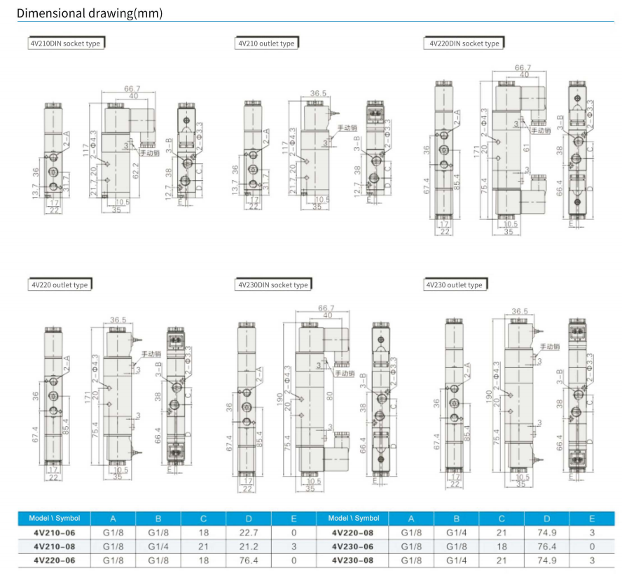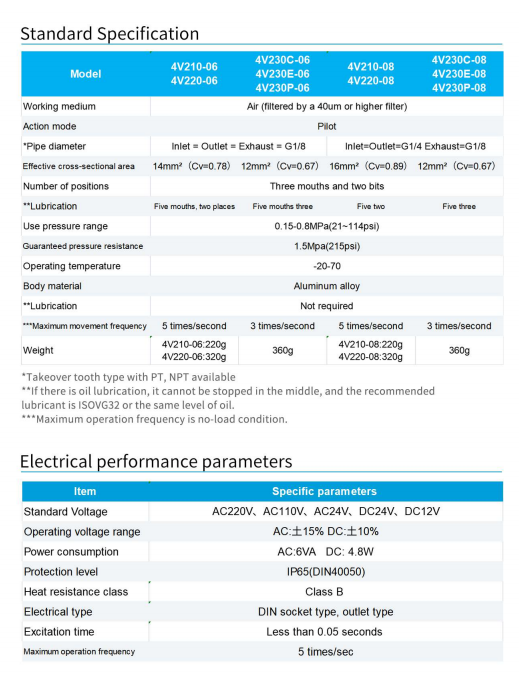 Applicability: The model should be selected based on parameters such as flow rate, pressure, and voltage (e.g. 4V210-08 represents interface 2 points, caliber G1/2)
