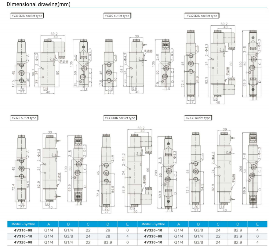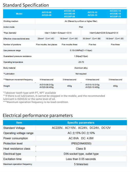Applicability: The model should be selected based on parameters such as flow rate, pressure, and voltage (e.g. 4V210-08 represents interface 2 points, caliber G1/2)